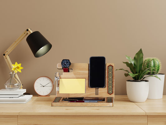 Art Meets Utility. Elevate your desk with handcrafted wooden organizers featuring authentic Khatam Kari inlay, the intricate art of Persia. Designed to hold your phones, watches, and keys with functional, timeless elegance.