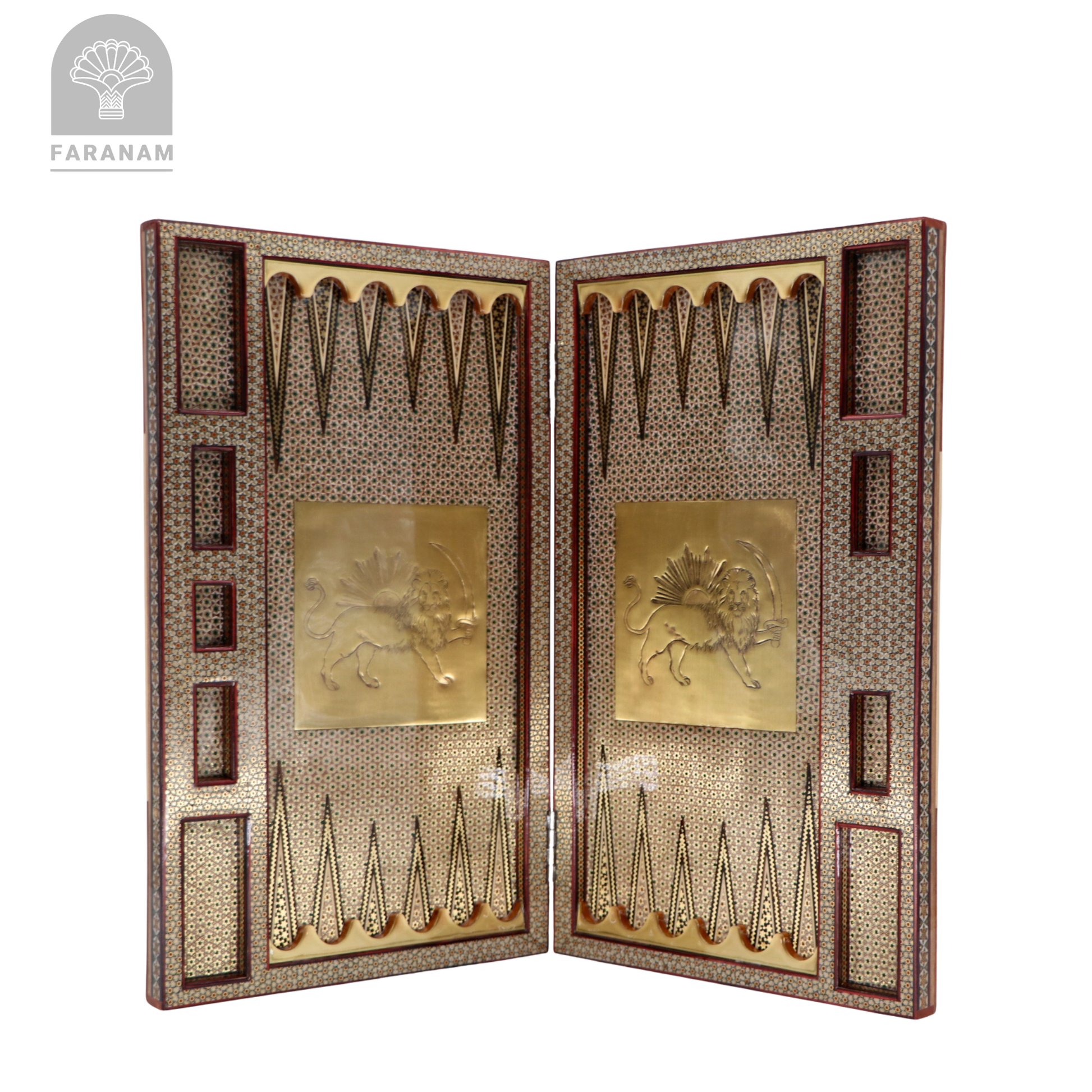 -Hand-etched brass Lion and Sun motif on the backgammon side